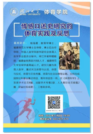 118日晚上19:00,福建师范大学体育科学学院教授杨海晨于线上为我院学生开展“情感口述史研究的体育实践与反思”专题讲座,参与此次主题讲座成员有2138cn太阳集团城副院长史文文、部分青年博士教师以及全体研究生,会议由史文文副院长担任主持。