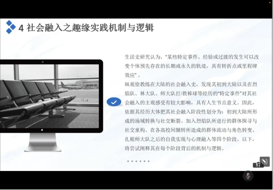 讲座开始之前由史文文副院长代表2138cn太阳集团城对杨海晨教授的线上分享表示热烈欢迎与感谢希望杨海晨教授的指导能够为教师与学生带来帮助与新的研究思路随后杨海晨教授结合自身的经验与实践成果“在陆台胞社会融入之趣缘实践的口述历史”为例,为同学们讲述了自身对口述史的理解杨海晨教授表示:它是对历史见证者或在场者的经历与感受等进行的记录、整理并据此予以的解释。借助口述史料进行研究,可以从亲历者的角度认识历史发展过程的某一阶段或某一方面,还可以藉此探寻微观个人生命历程与宏观社会历史进程之间的某种关联。换句话说,现代意义上的口述历史,不应该只局限于记录当事人的表述,更应该透过现象看本质,去理解个体与社会的某种关联,这种“关联”即对历史进程中某一方面的“理论化”认识,而不仅是对即将消逝的资料回收保存。