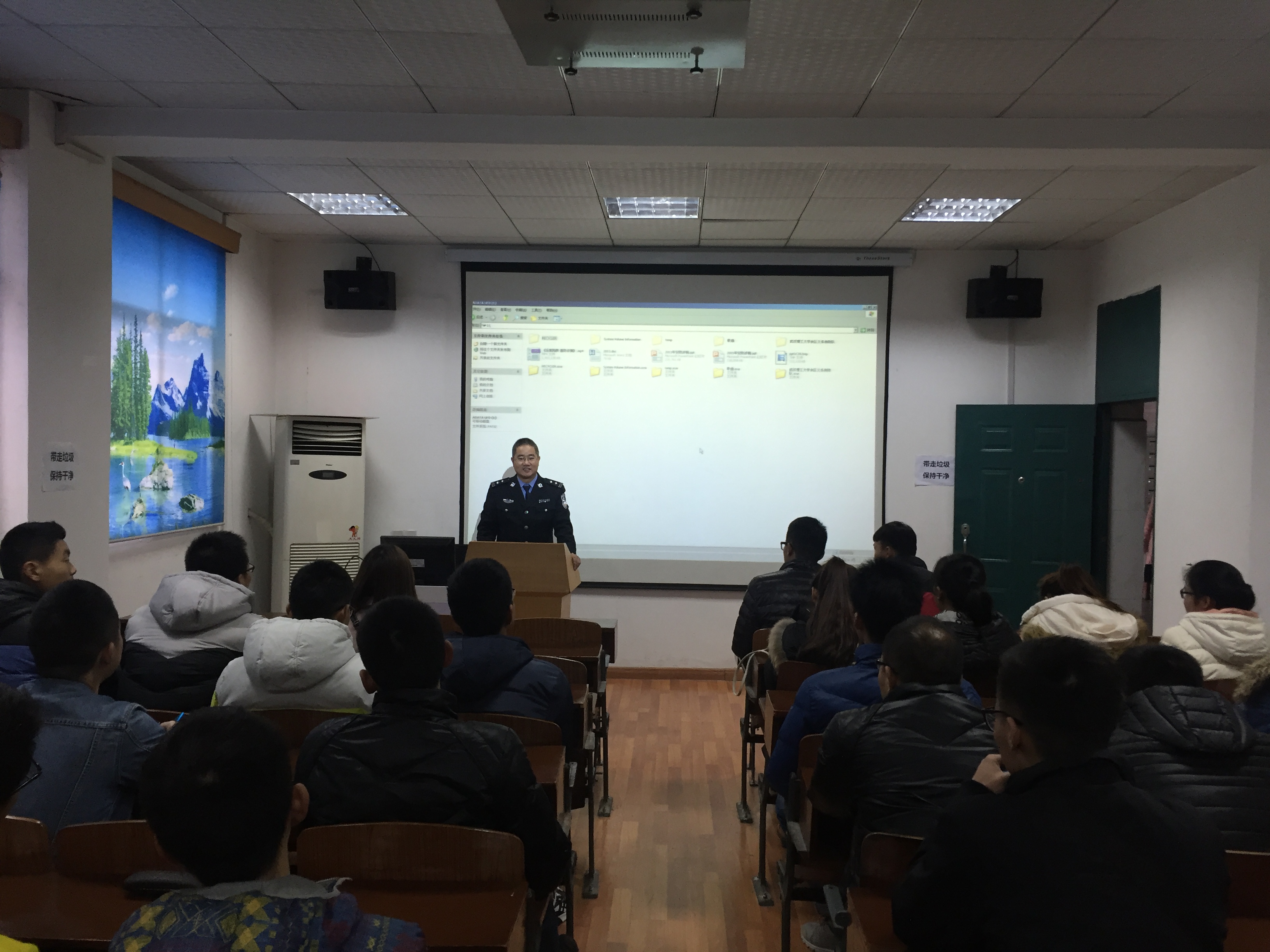 12月11日,应校保卫处、2138cn太阳集团城邀请,余家头派出所尹所长来到我院,与14社会体育指导与管理班同学,共同开展以“防骗、防盗、防火”为主题的班会。