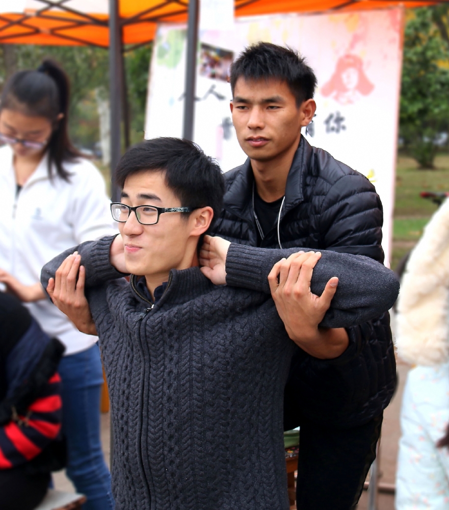 负责按摩服务的都是体院13级运动人体科学专业的同学,他们课堂有学习过医学经络方面的知识。今天现场主要通过按摩背部来达到疏通血脉,缓解压力的效果。服务对象上到80高龄退休教师,下到大一学生,学校食堂教职工、保安人员闻讯也前来体验了一次。志愿者陈青说:“人体按摩在年龄上并无限制,只是小孩骨骼稍稚嫩,需要按摩时注意力度。经常不运动和老人们可以多按摩,可以帮助疏通筋脉。”