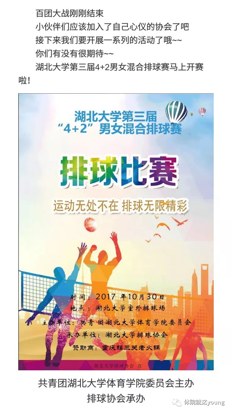 运动无处不在,排球无限精彩,相信此次排球大赛定能让众多体院学子一展才华,在运动场上挥洒激情的汗水。
