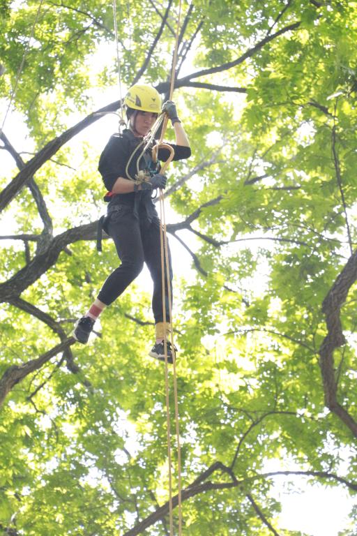 工作攀爬测试选手使用绳索、安全带等装备在树上移动的能力。本次参赛者须从树上的出发点开始,行走树上 5个工作站,并在每个工作位置执行不同的指定任务。 每个工作站都设置了一个响铃,而参赛者必须敲过响铃才可继续前往下一站。 5 个工作站包括了手锯、枝条投掷、高枝剪、行走枝干及着地五种工作任务,最终来自河南的刘育新,赢得了“工作攀爬”项目男子比赛的第一名,刘育新今年51岁了,是本次参赛中年龄最大的选手,他直言自己虽然体力可能不如年轻人,但经验更为丰富,“小时候我就是爬树高手,现在也经常练习!”他自信地表示,“我未必输给年轻人。”