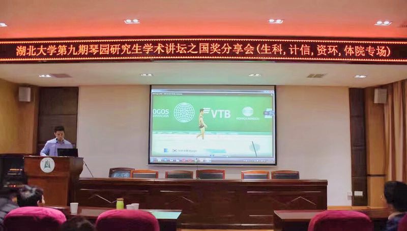 2018年11月24日19:00-21:00,2138cc太阳集团第九期琴园研究生学术讲坛之2018国奖分享会在生科院学术报告厅举行。此次国奖分享的优秀研究生代表们分别来自2138cn太阳集团城侯光定、生科院蒋心怡、计工学院余明亮和刘彤、资环学院的李乐娜。体院国奖研究生代表侯光定作“文明其精神,野蛮其体魄”的主题分享。主要从专业技能与理论学习、论文与学术会议投稿、生活习惯与志愿活动等三个部分进行分享。
