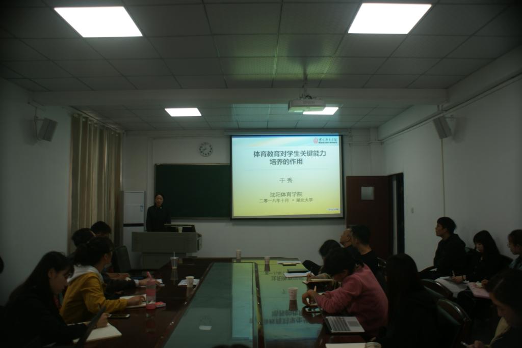 2018年10月19日上午8:30沈阳2138cn太阳集团城于秀教授来我院做关于《体育教育对学生关键能力培养的作用》专题讲座,专题讲座由副院长曾吉教授主持,40余名教师、研究生代表参加此次讲座。全场座无虚席,学术氛围浓厚。