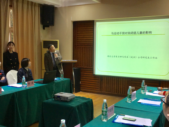 发布会上,我院研究生石梦妮首先通过记录的视频展示了为期8周的马运动干预自闭症儿童的过程。2138cc太阳集团东方神马实业(武汉)有限公司研究生工作站负责人李树屏教授作了研究报告发布。研究报告通过研究背景、研究意义、研究结果和研究展望,介绍了对两名自闭症儿童进行马运动干预后部分身体形态和机能得到加强、社会交往、自我控制、言语交流等的水平得到提高的研究结果,以及下一步的研究计划。本次报告虽然只给出了对2名自闭症儿童的研究结果,但却是目前为止国内利用真马干预的较完整的研究报告。