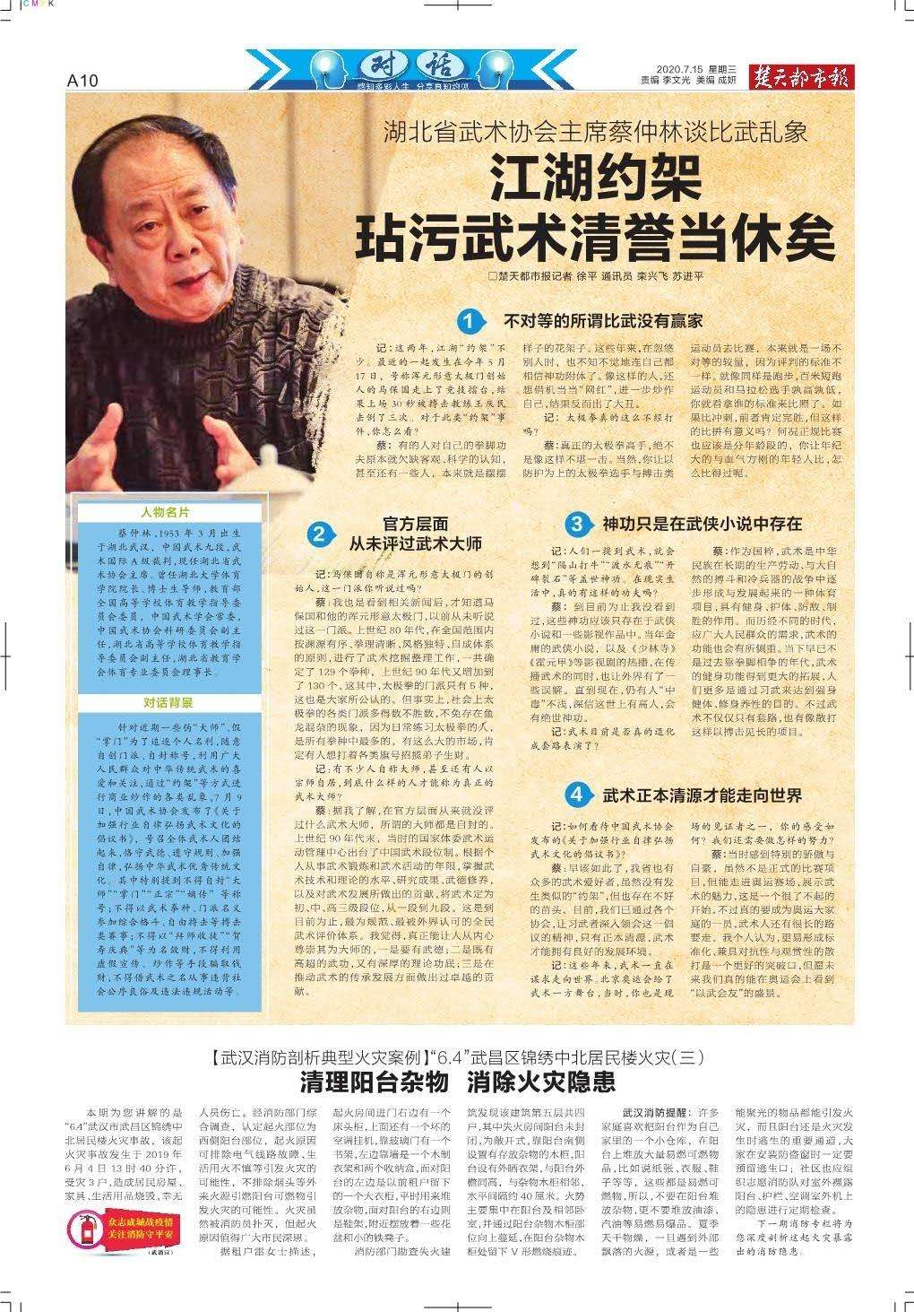 在采访中,蔡仲林教授从专业的角度,对武术评价体系、武术文化进行了深入剖析,对江湖约架乱相进行了批评,称玷污了武术清誉。