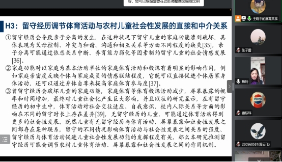 11日下午15时,“研究生学术论坛”分别在三个腾讯会议室同时进行,本次论坛共收到论文66篇,经过校外专家评审,共24篇论文获奖。活动中同学们向评委老师们详细阐述了选题的国内外研究现状、背景、意义、研究方法以及结论,思路清晰,通俗易懂,充分展现了体院学子对科研严谨的态度。随后余良华、刘亮、代方梅等六名教授分别进行点评,针对每位同学研究的不足之处提出了建议和指导。待所有同学汇报结束,不同会场的老师们均对本次论坛做出了很高的评价,一致认为此次活动充分调动了大家的科研积极性。