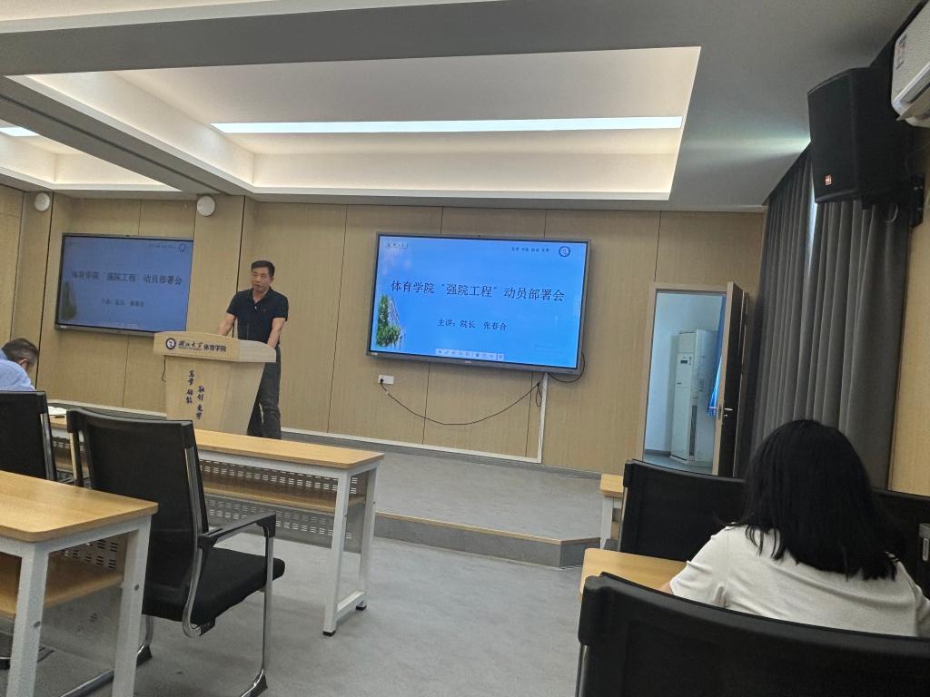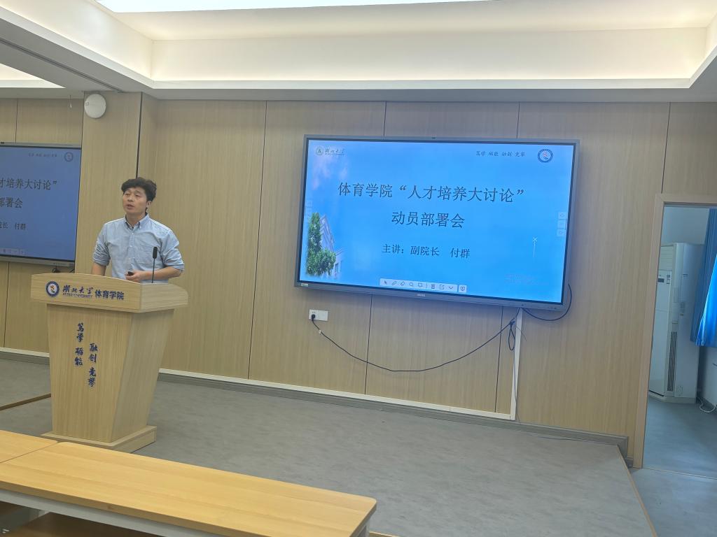 副院长付群就学院开展“人才培养大讨论”进行动员部署。他传达了学校动员部署会和刘建平校长讲话精神,从活动背景、指导思想、讨论主题、活动安排、参与人员、具体要求及保障措施等方面对学校活动方案进行了详细解读,部署学院活动安排,要求各教研室按照学校总体部署和学院活动计划,积极落实和组织“人才培养大讨论”活动并总结讨论成果,为学院研制《体育专业人才培养质量提升方案》献计献策,助力学校人才培养提质进位。