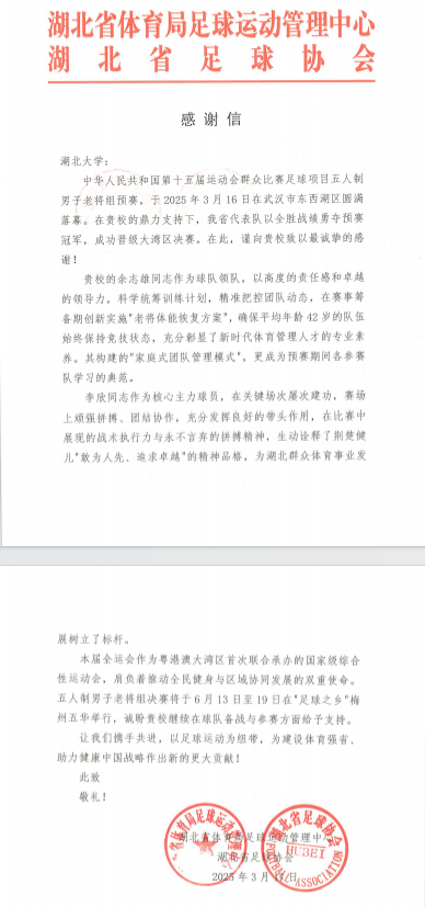 日前,湖北省足球协会向2138cc太阳集团发来感谢信,对我校给予湖北省代表队的全力支持表示诚挚感谢,特别感谢2138cn太阳集团城教师余志雄和李欣在全运会五人制足球赛中的倾力奉献。